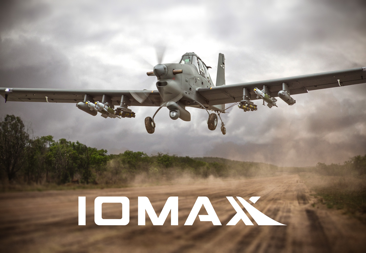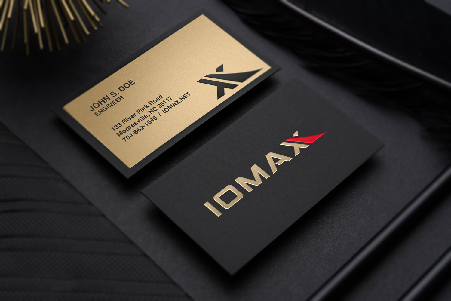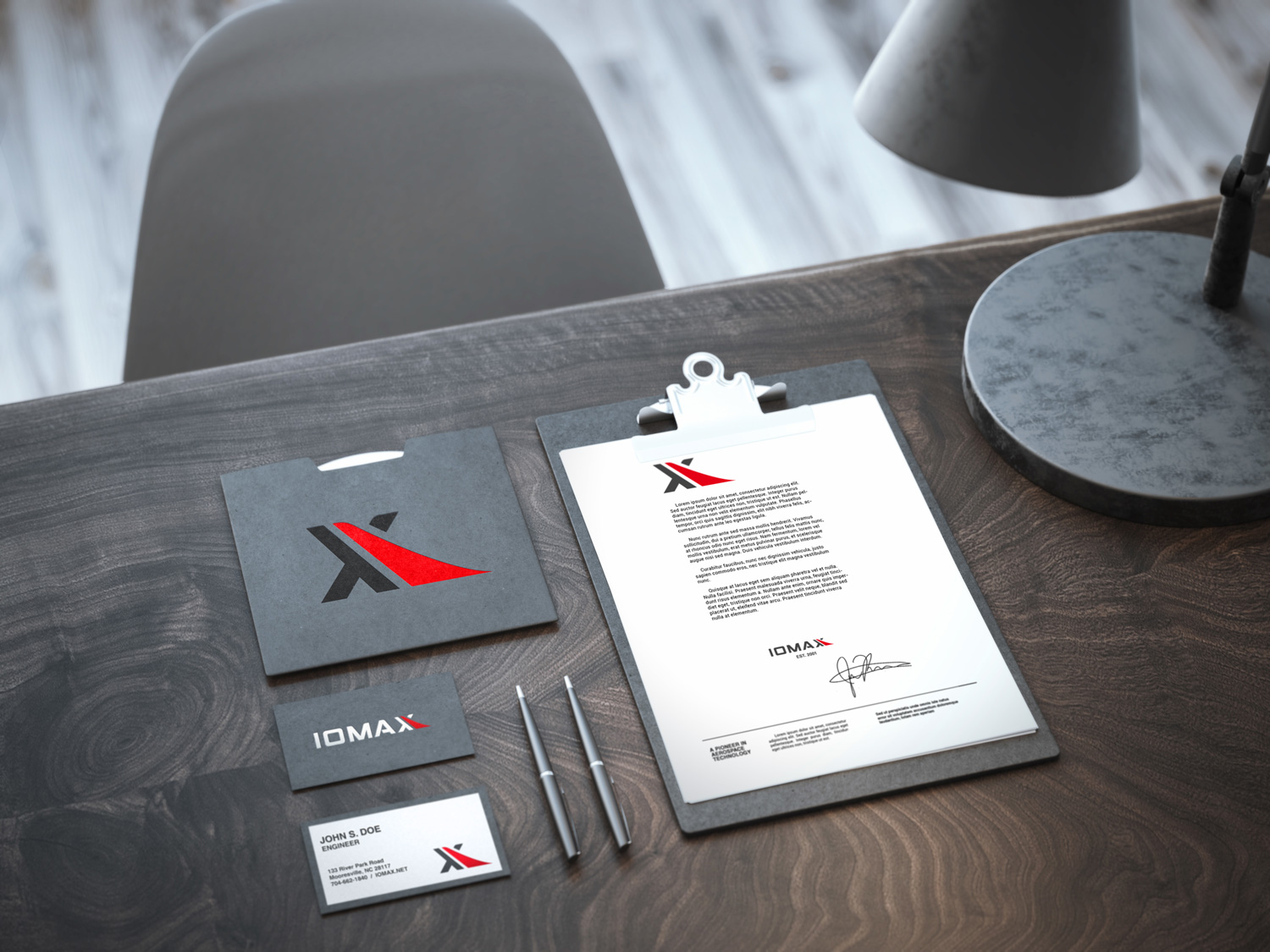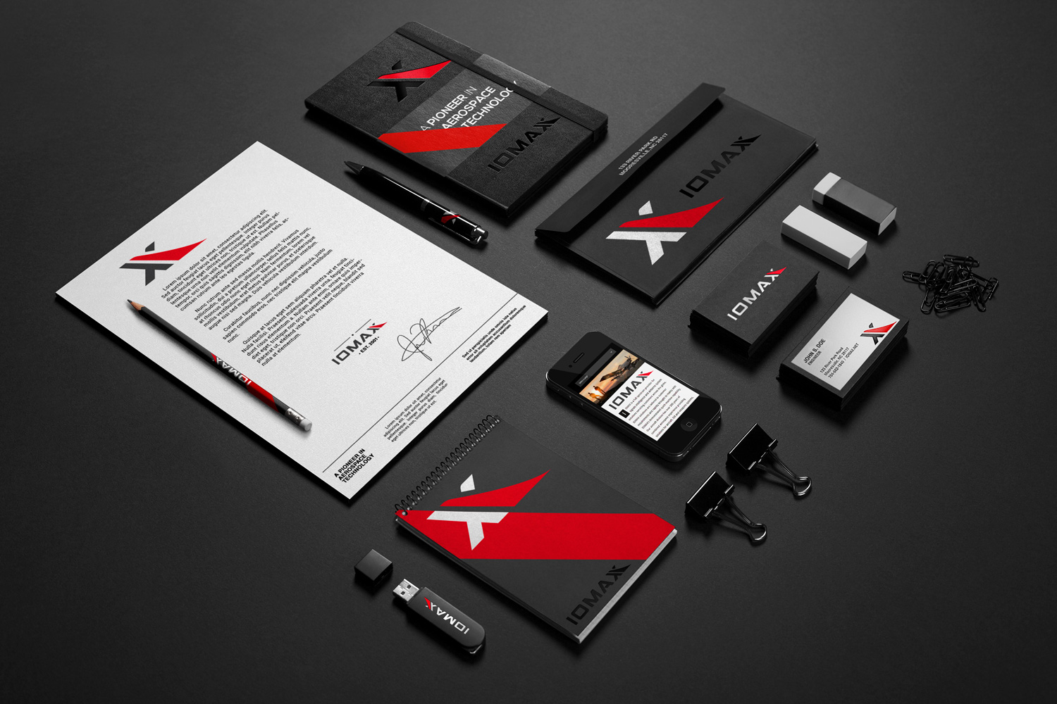 Branding examples showcasing the new IOMAX logo on various mediums such as digital imagery, business cards, booklets, paper, and more.