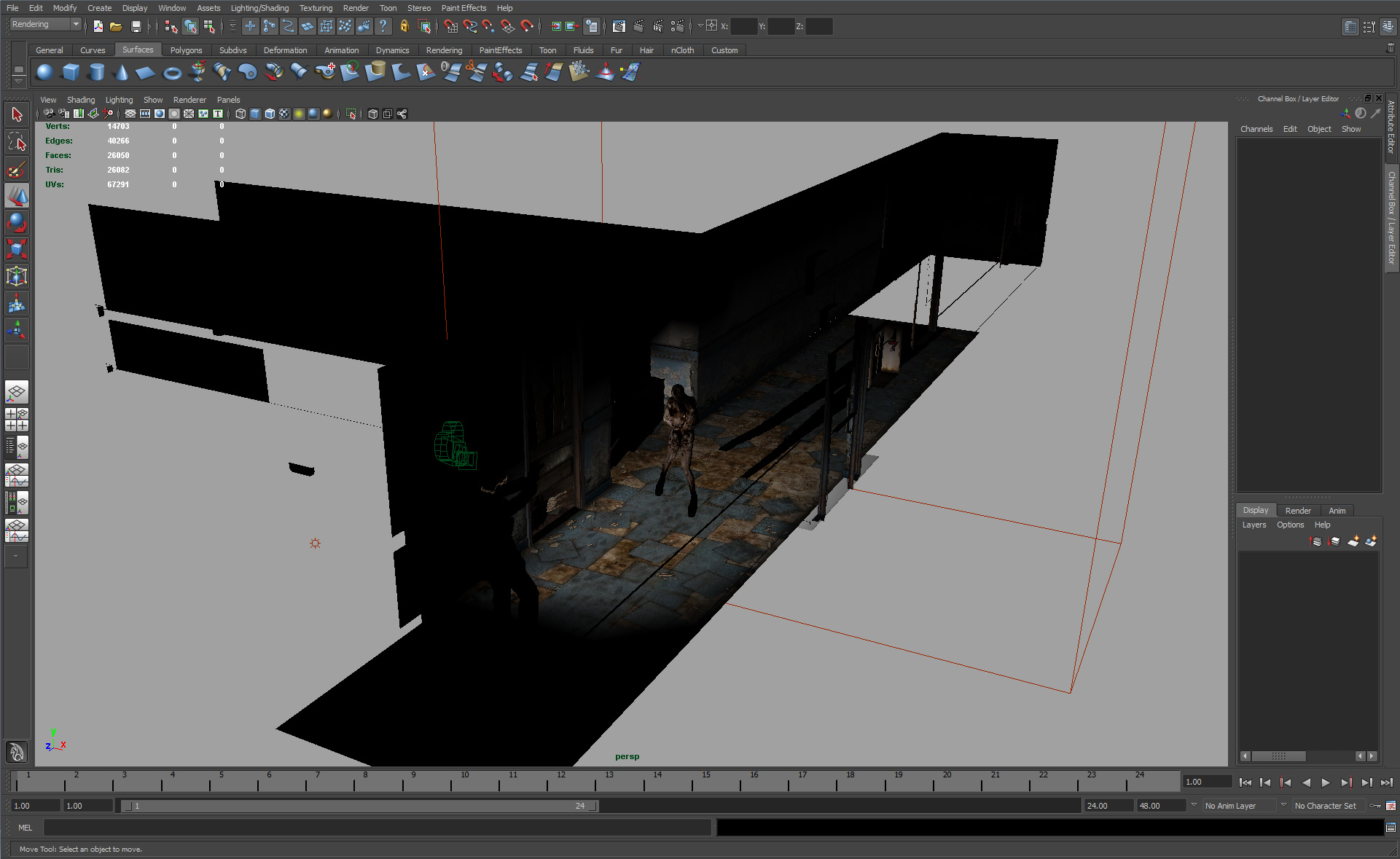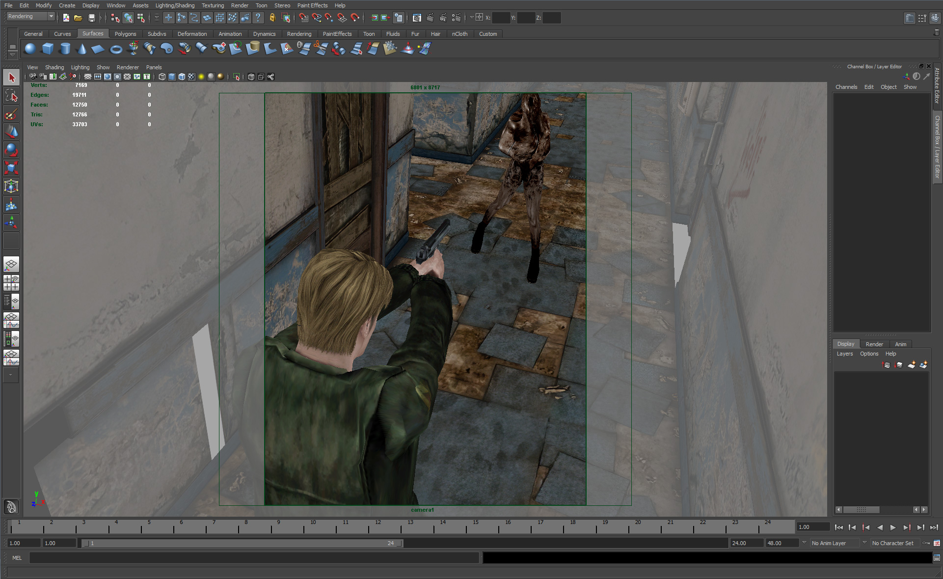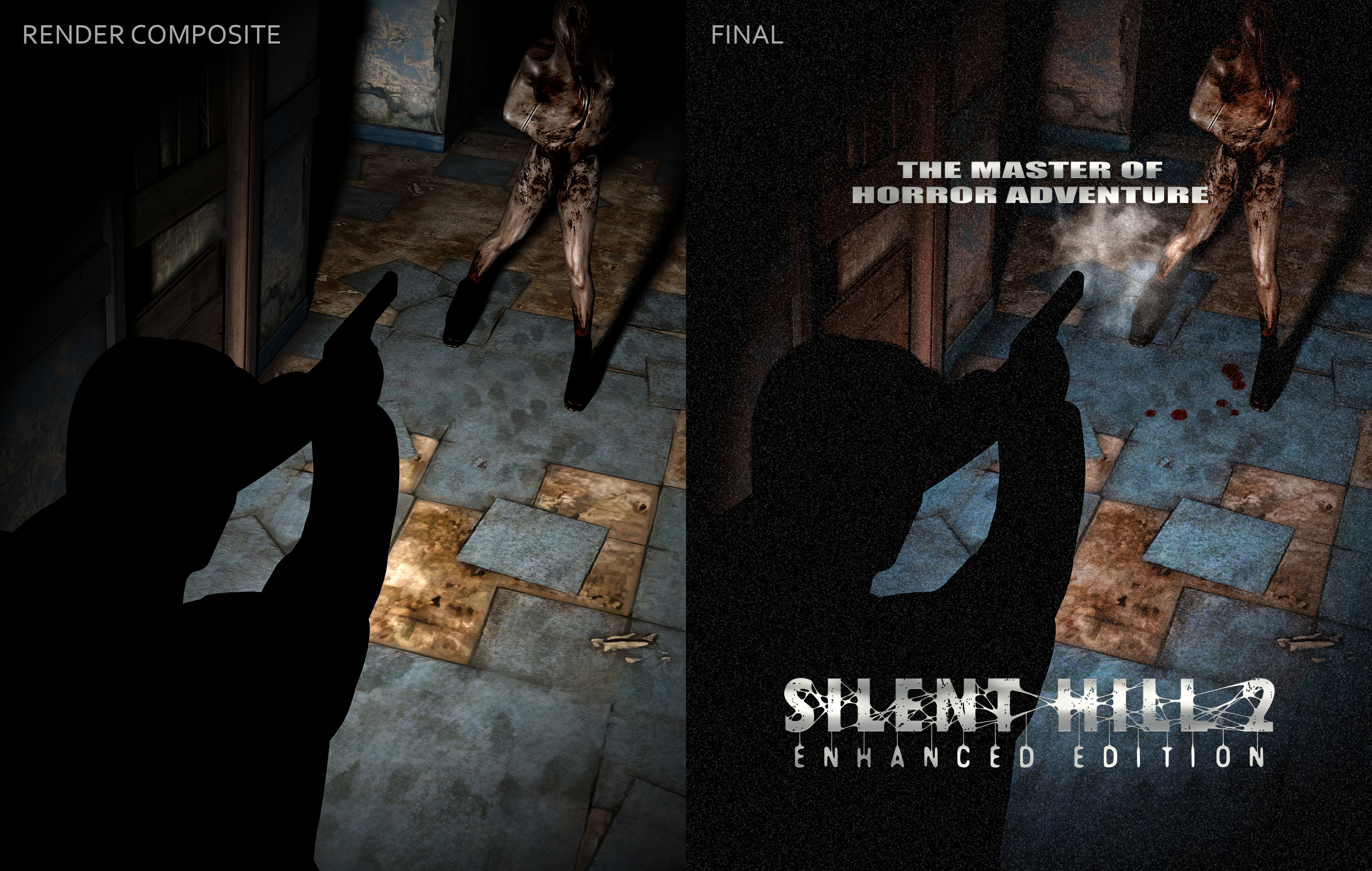 Creation of a marketing poster for Silent Hill 2: Enhanced Edition. To create this poster, the composition was staged in the game in real-time, then a 3D “snapshot” of the scene was captured for export. The 3D scene was adjusted and fine-tuned in Maya (3D editing software) for composite rendering, and final edits/corrections were completed in Photoshop.